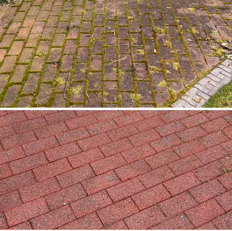 Using soft washing sterilization treatment and gentle pressure to remove algae, moss and streaks from driveways and walkways.